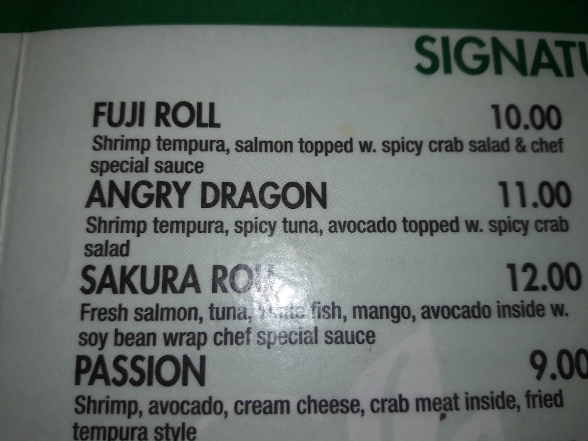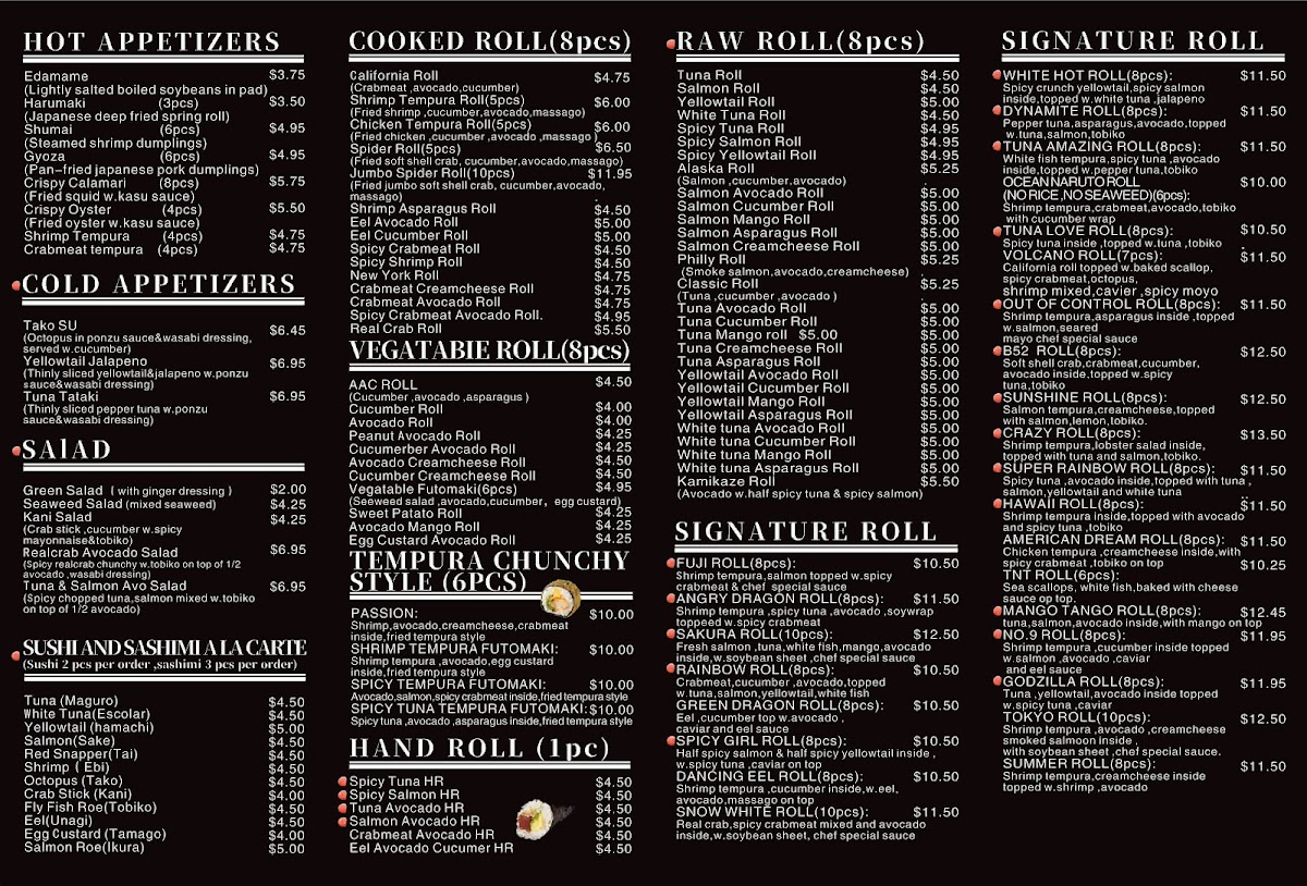 Tuna roll, salmon roll, yellowtail roll, tuna avocado roll, salmon avocado roll, yellowtail avocado roll, tuna mango roll, salm